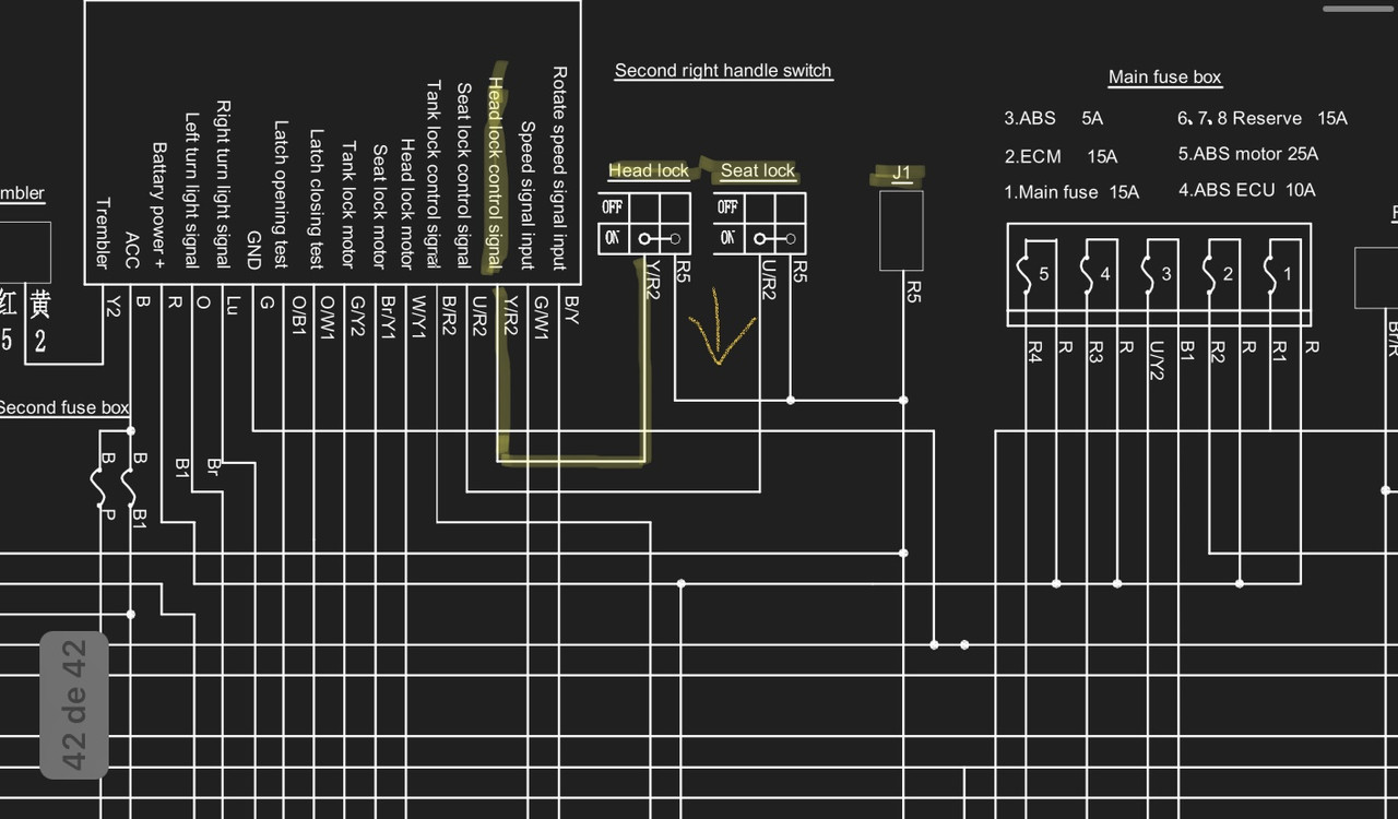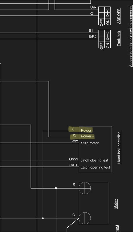 Me he revisado un poco el mapa eléctrico de la R310 que me parece que es la suya, diría yo que el Head Lock es el bloqueo del manillar, ya que veo que va ligado también al bloqueo del asiento y del tanque. El problema está en que si no tiene el Head Lock conectado no le cierra el circuito, la única forma que tiene de cerrarlo es hacer un puente en el conector del head lock con la esperanza de que no le pete ningún fusible.